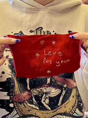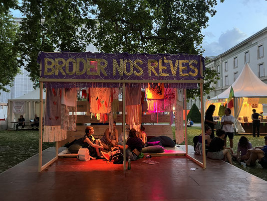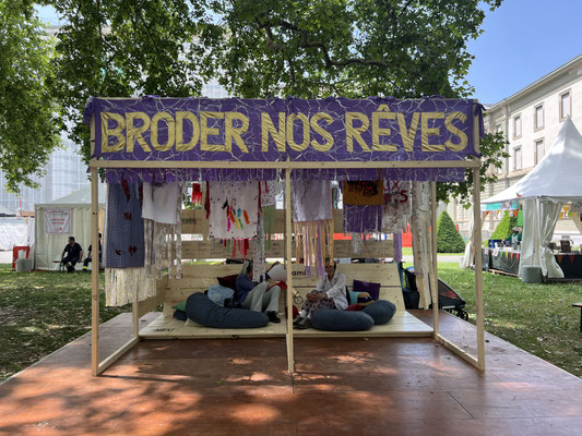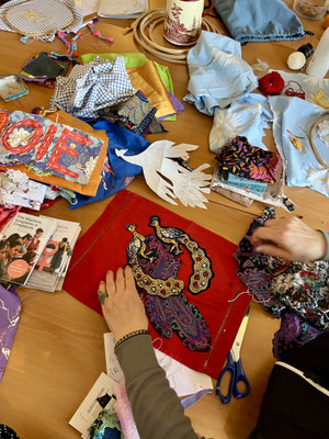 Dans une ambiance joyeuse et bienveillante, l’imaginaire a pris forme sur des morceaux de literie colorée, récupérés auprès de la Coordination Textile Genevoise.